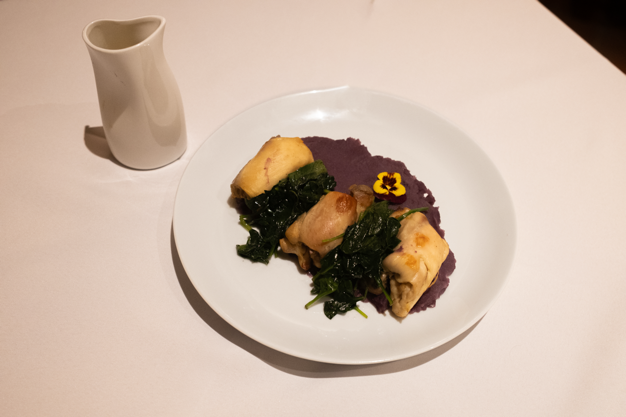 Chicken Fricassée with purple sweet potato purée and spinach